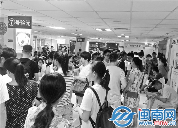 廈門眼科中心候診大廳擠滿陪同來做近視激光手術(shù)患者的家屬