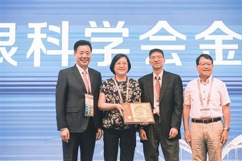 ▲黎曉新總院長(zhǎng)榮獲中美眼科學(xué)會(huì)“金鑰匙獎(jiǎng)”(左二為黎曉新)