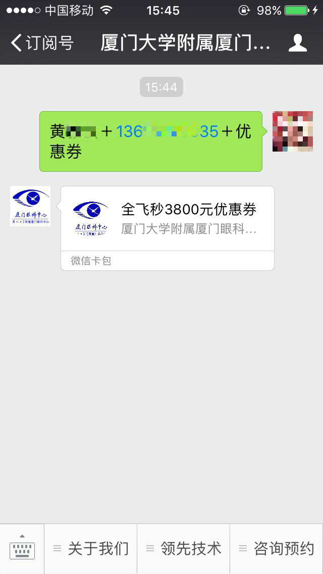 2、在微信公眾號后臺回復(fù)“姓名+電話+優(yōu)惠券”,即可點擊領(lǐng)取優(yōu)惠券。