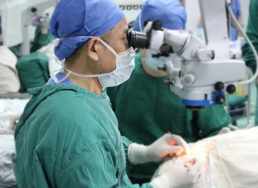 手術(shù)當(dāng)天,在沖洗消毒后,吳護(hù)平主任為童童分離并切除了假性胬肉組織。由于受傷時(shí)間長,童童胬肉下方的角鞏膜處溶解變薄,吳護(hù)平主任在切除假性胬肉后,又切除部分病變角膜及鞏膜,并為其成功移植角膜及部分鞏膜組織。