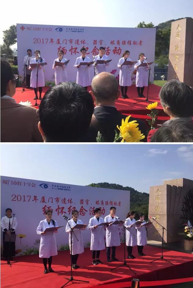 活動中,廈門大學(xué)附屬廈門眼科中心醫(yī)務(wù)工作者們帶來了《生命的禮物》的詩朗誦表演,表達了對捐獻者無償獻出珍貴“生命禮物”的崇敬與感恩之情。廈門大學(xué)醫(yī)學(xué)院青年志愿者協(xié)會在紀(jì)念碑前宣誓并遞上了獻花。捐獻者紀(jì)念碑前,手捧白菊的人群中,有蹣跚而行的白發(fā)老人,有一臉稚氣的年幼孩童,更多的是中年人和青年人。人群中,有人哭泣,有人默默佇立,一遍遍撫摸著刻在紀(jì)念碑上親人的名字。