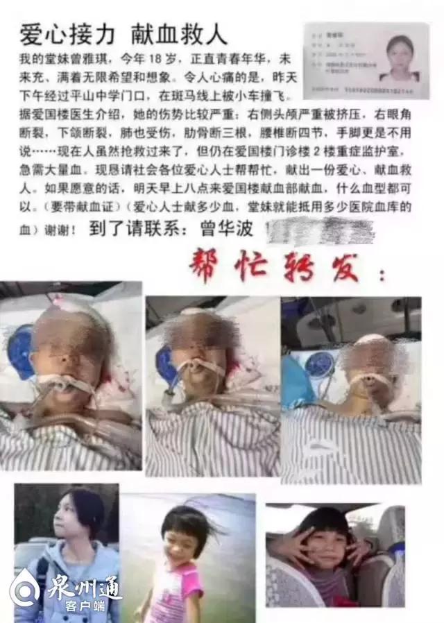 雅琪手術(shù)后第二天,一場(chǎng)關(guān)于她的愛(ài)心接力在朋友圈傳開了,一條“愛(ài)心接力獻(xiàn)血救人——晉江少女曾雅琪不幸遭遇車禍”的求助信息被眾人轉(zhuǎn)發(fā)。