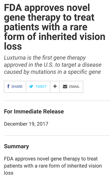 圣誕前夕,從美國傳來了重磅消息:“針對由RPE65基因突變導(dǎo)致的雷柏氏先天性黑朦2型(RPE65基因突變引起)的基因替代療法藥物L(fēng)uxturna(voretigene neparvovec-rzyl)獲FDA批準(zhǔn)上市!失明患者重見光明為時(shí)不遠(yuǎn)!