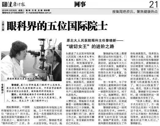 2018年10月30日,人民日報社屬報紙《健康時報》對廈門大學(xué)附屬廈門眼科中心總院長黎曉新進行大篇幅報道。