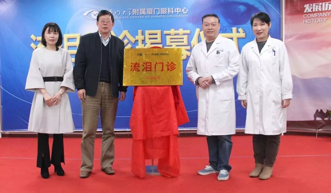 ▲廈門(mén)眼科中心業(yè)務(wù)院長(zhǎng)侯家敏、眼整形專(zhuān)科學(xué)科周太平主任、淚道疾病專(zhuān)家鄧?yán)っ鳌?zhí)行總經(jīng)理姚鄭玲玲等為流淚門(mén)診揭牌