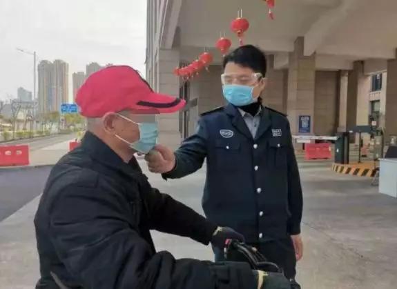 戴上護(hù)目鏡、口罩,拿起手中的額溫槍,保安在門崗為入院人員測(cè)量體溫,守好崗。