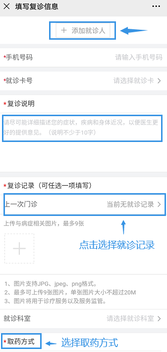 填寫就診人信息、復診說明,對醫(yī)生詳細描述目前的癥狀;在復診記錄中,可以添加往期復診記錄,以便醫(yī)生快速了解病史