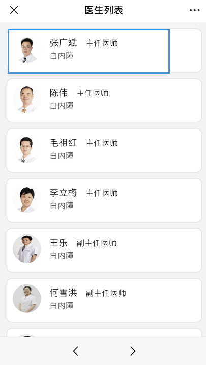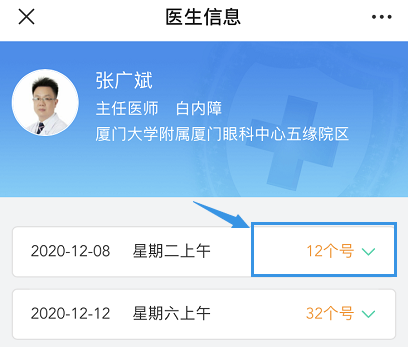 點擊“預約掛號”,選擇需要預約院區(qū)(如五緣院區(qū)),搜索或者選擇需要預約的科室(如白內(nèi)障科),選擇需要預約的醫(yī)生(如張廣斌醫(yī)生),確認預約時間
