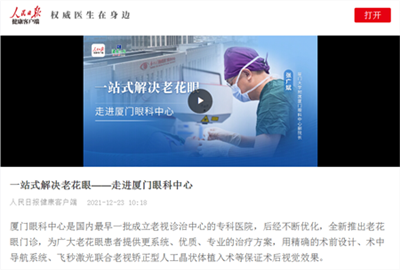 人民日報走進(jìn)廈門眼科中心,專題報道老花眼診療,張廣斌院長受邀做專題采訪。海西晨報、海峽導(dǎo)報、東南早報、健康時報、今日頭條、百度健康、騰訊視頻、愛奇藝、新浪微博等十余個平臺聯(lián)袂報道!