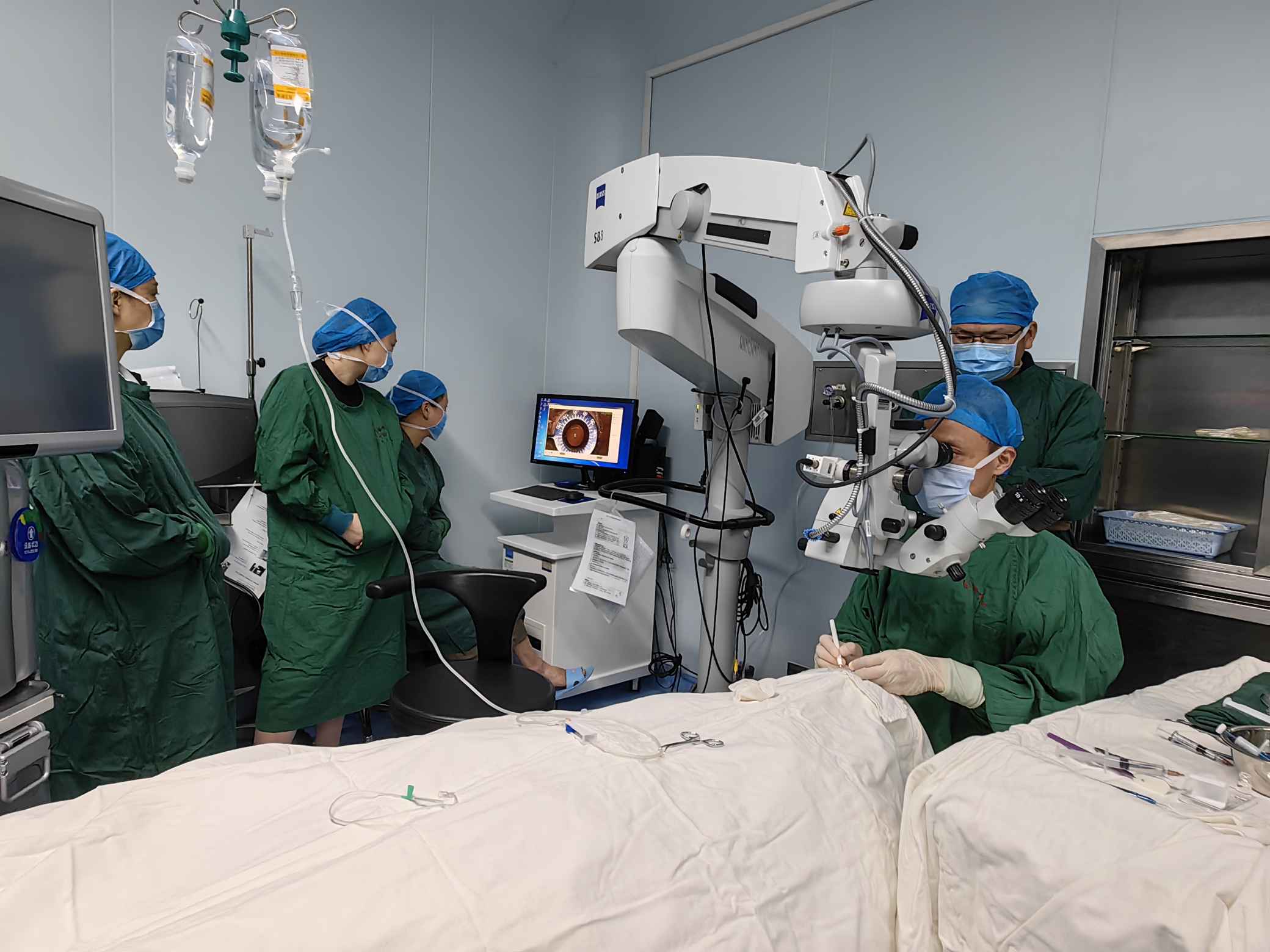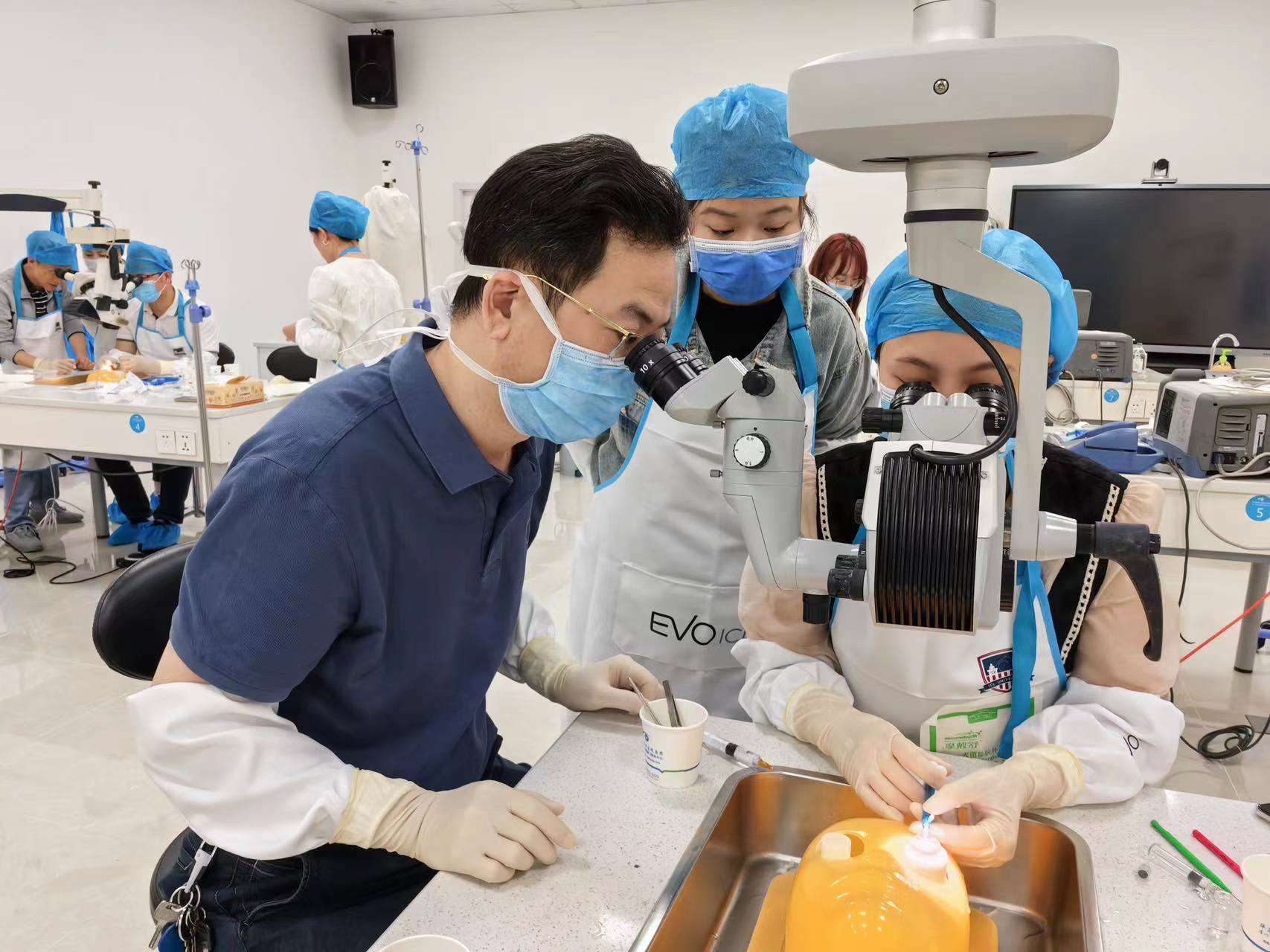 手術(shù)觀摩環(huán)節(jié),劉才遠(yuǎn)教授、鄭林主任對(duì)學(xué)員們進(jìn)行一對(duì)一手術(shù)技巧的帶教操作指導(dǎo)。他們不僅是國(guó)內(nèi)為數(shù)不多ICL手術(shù)經(jīng)驗(yàn)豐富的專家,還是各地ICL手術(shù)醫(yī)生的帶教、培養(yǎng)及考核導(dǎo)師。