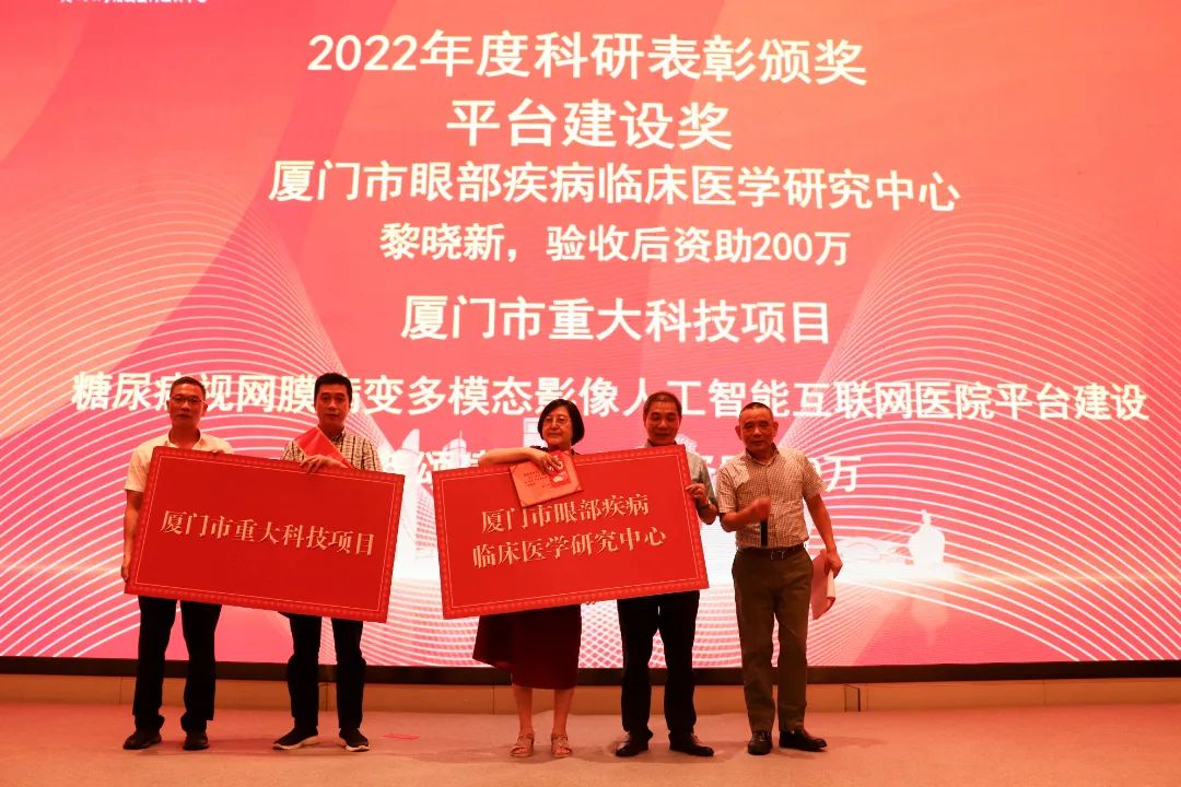 會上,2022年度科研表彰頒獎盛典同步舉行。2022年度,我院科研工作再結(jié)碩果,醫(yī)院學(xué)術(shù)品牌的影響力和號召力得到進一步提升。我院獲批成為廈門市眼部疾病臨床醫(yī)學(xué)研究中心,榮登2022年度中國醫(yī)院科技量值(眼科學(xué))榜單,并連續(xù)十年衛(wèi)冕福建省眼科學(xué)第 一,實力領(lǐng)跑。