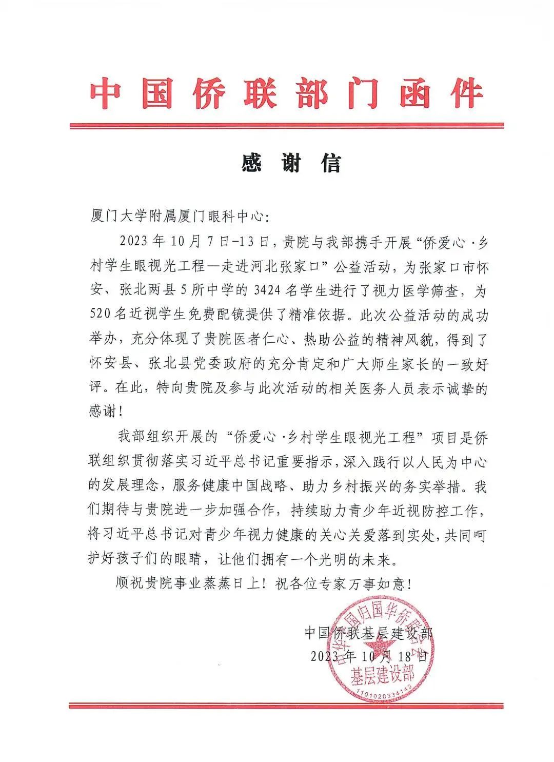 近日,廈門眼科中心接連收到來(lái)自中國(guó)僑聯(lián)基層建設(shè)部、懷安縣和張北縣人民政府辦公室的三封感謝信,信中對(duì)廈門眼科中心在“僑愛(ài)心·鄉(xiāng)村學(xué)生眼視光工程-走進(jìn)河北張家口”公益活動(dòng)中的無(wú)私付出及對(duì)鄉(xiāng)村孩子的寶貴的幫助給予充分認(rèn)可與真摯感謝。