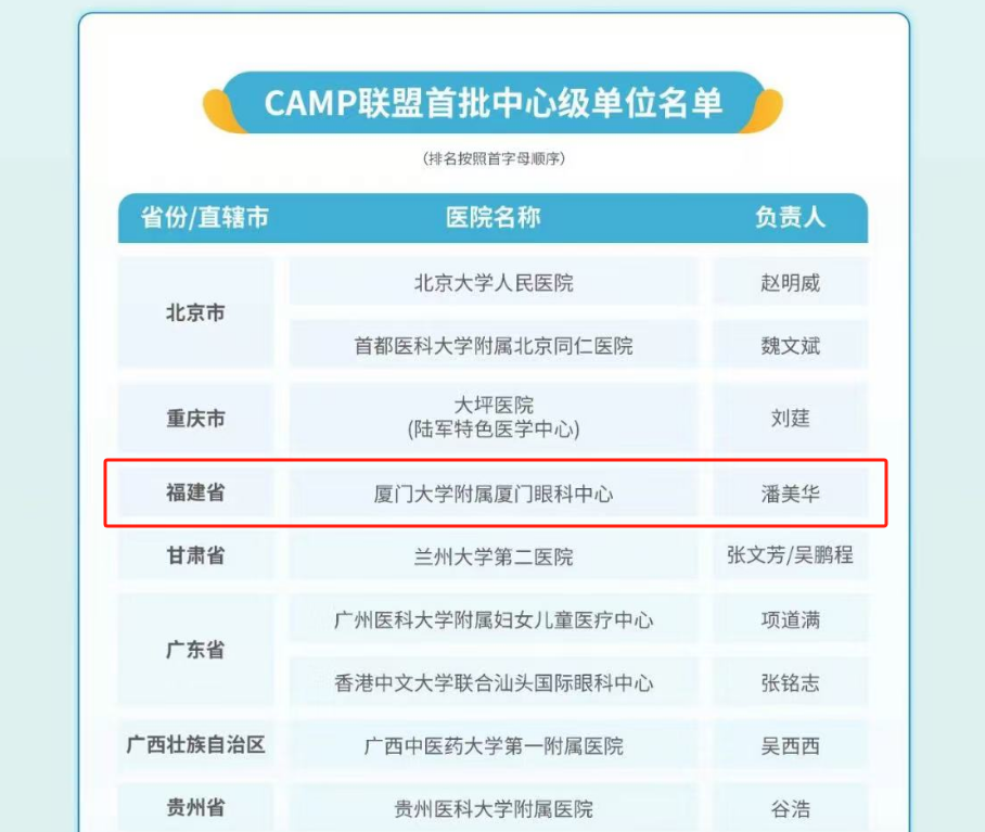 CAMP由國家眼部疾病臨床醫(yī)學(xué)研究中心牽頭組建,在健康中國戰(zhàn)略和近視防控政策的指引下,以持續(xù)提升基層眼健康服務(wù)能力為核心,旨在通過整合眼科醫(yī)療資源、科研力量和臨床經(jīng)驗,聚力構(gòu)建一個高效、協(xié)同、創(chuàng)新的近視防控服務(wù)體系和覆蓋全國的眼健康醫(yī)療服務(wù)網(wǎng)絡(luò)。聯(lián)盟啟動報名后,共有來自29個省和直轄市的434家醫(yī)療機構(gòu)報名,其中報名參選中心級單位的有108家,最終遴選出首批中心級單位33家。此次廈門大學(xué)附屬廈門眼科中心成功獲選為中心級單位,標(biāo)志著醫(yī)院在國內(nèi)眼科領(lǐng)域尤其是近視防控領(lǐng)域具有顯著的影響力和專業(yè)能力,是聯(lián)盟推進近視防控工作的重要力量。