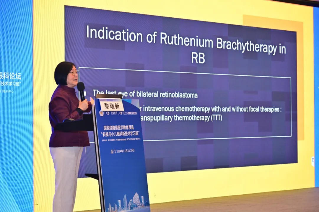▲ 國(guó)際眼科科學(xué)院院士、廈門(mén)眼科中心總院長(zhǎng)黎曉新教授分享《雙側(cè)RB的第二只眼治療》