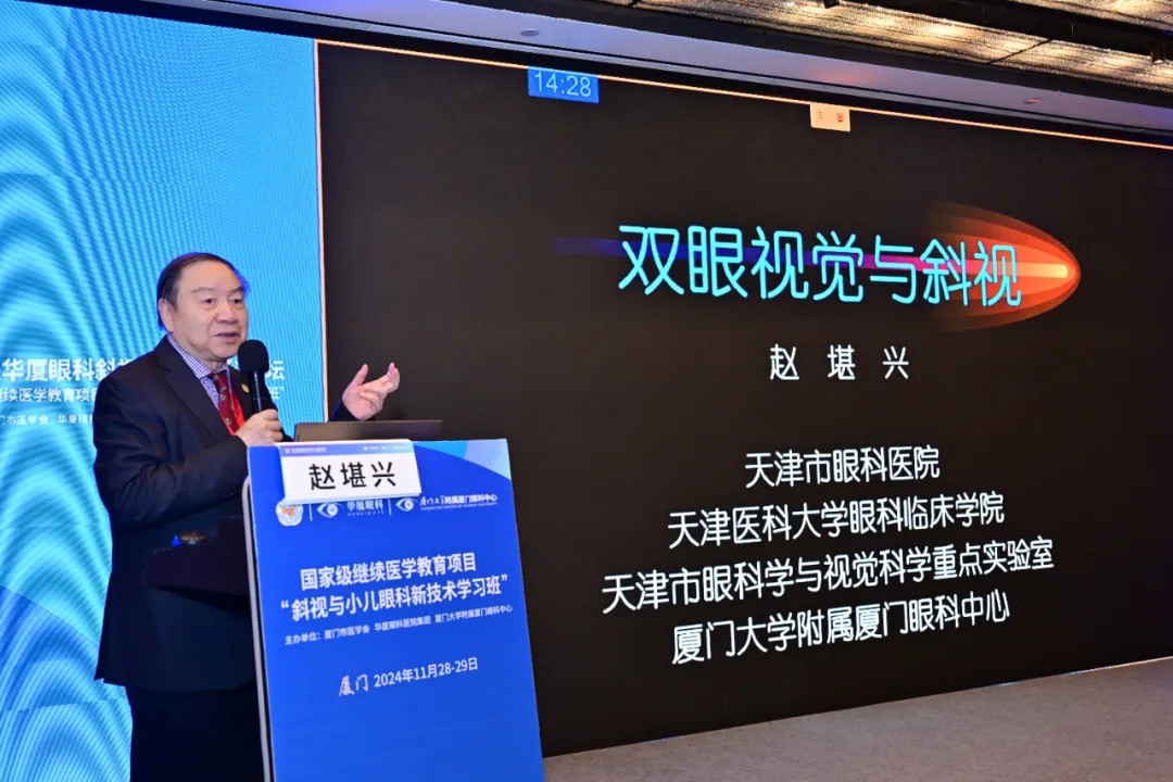 開(kāi)幕式后,國(guó)際眼科科學(xué)院院士、華廈眼科醫(yī)院集團(tuán)專(zhuān)家委員會(huì)主席趙堪興教授及國(guó)際眼科科學(xué)院院士、廈門(mén)眼科中心總院長(zhǎng)黎曉新教授率先開(kāi)啟了精彩的專(zhuān)題學(xué)術(shù)分享。趙堪興教授以《雙眼視覺(jué)與斜視》為主題,深入講解了雙眼視覺(jué)的生理機(jī)制、發(fā)育及其障礙,提出在兒童眼疾的臨床診療過(guò)程中要結(jié)合雙眼視的實(shí)際情況詳細(xì)分析病情,明確診斷后進(jìn)行個(gè)性化診療。黎曉新教授以《雙側(cè)RB的第二只眼治療》為題,結(jié)合多個(gè)臨床案例,詳細(xì)介紹了視網(wǎng)膜母細(xì)胞瘤第二只眼的診療要點(diǎn)難點(diǎn)及治療方法,并分享了新技術(shù)“釕核素放射熱敷貼”對(duì)于RB第二只眼的治療效果。