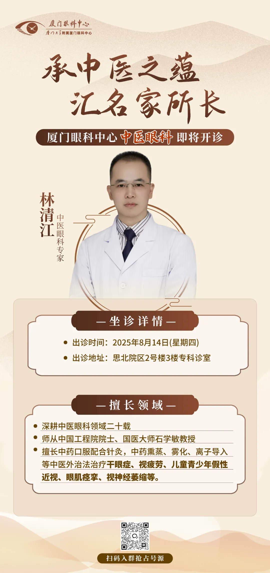 8月14日,林清江醫(yī)生將親自坐鎮(zhèn)廈門眼科中心中醫(yī)眼科門診,目前已開(kāi)設(shè)專家預(yù)約通道。